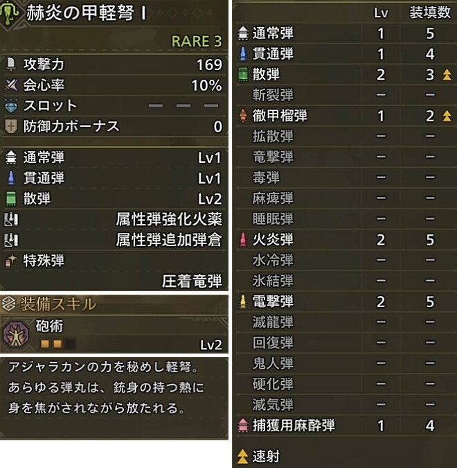 散弾は反動がネック、徹甲榴弾は装填速度がネックなので速射まわりは諦めて、2種の属性弾を生かす方向へ