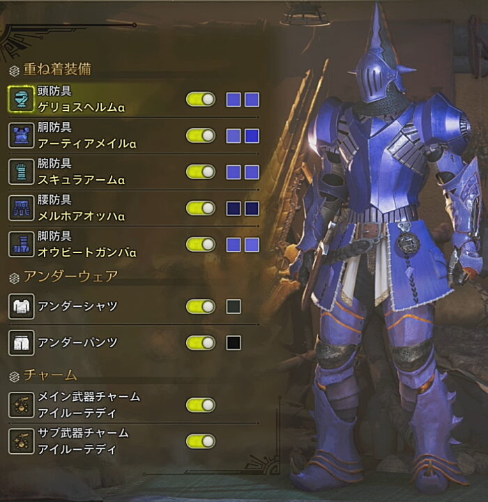 モンハン防具の胴パーツは肩まで含むものが多いので、肩の色だけを変えることが難しいです