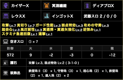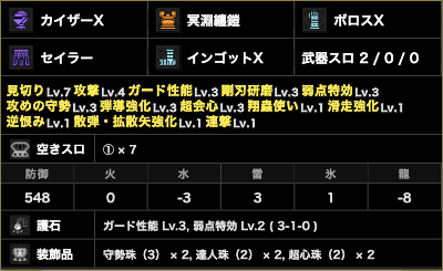 他の武器だとここから攻撃辺りを減らしてガ性増やしたり切れ味関連のスキル積まなきゃいけない