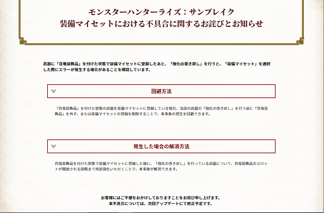 『モンスターハンターライズ:サンブレイク』 Ver.11.0.1にて、一定の条件下で装備マイセット選択時にエラー(ソフトが終了してしまう不具合)が発生する場合があることが確認されています。