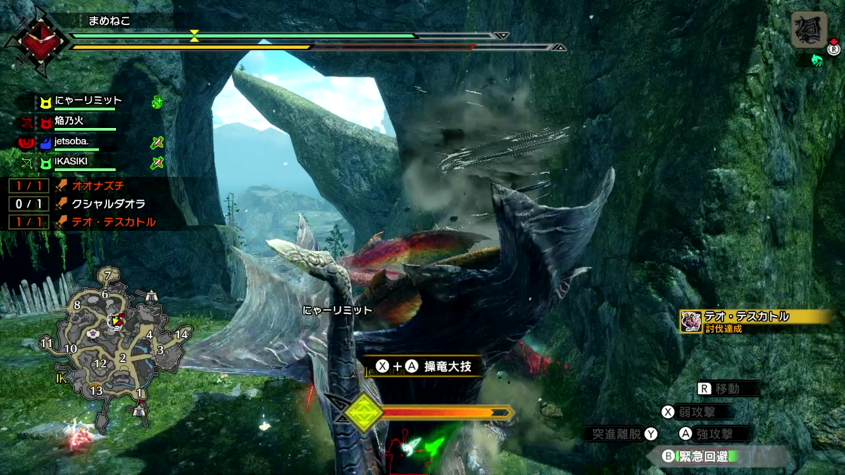 最後の方にクシャルダオラが乱入してきて操竜になって操竜大技になったタイミングでテオが力尽きました。。。。この大技にまでなったやりどころのない怒りをどこにぶつけたら良いのやら(笑)