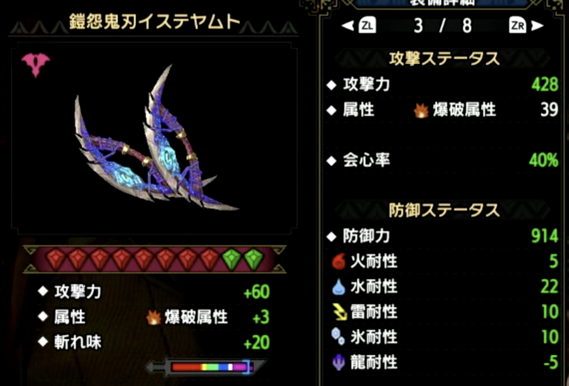 まずはそな前に昨日作った、双剣の鎧怨鬼刃イステヤムトの傀異錬成からです。