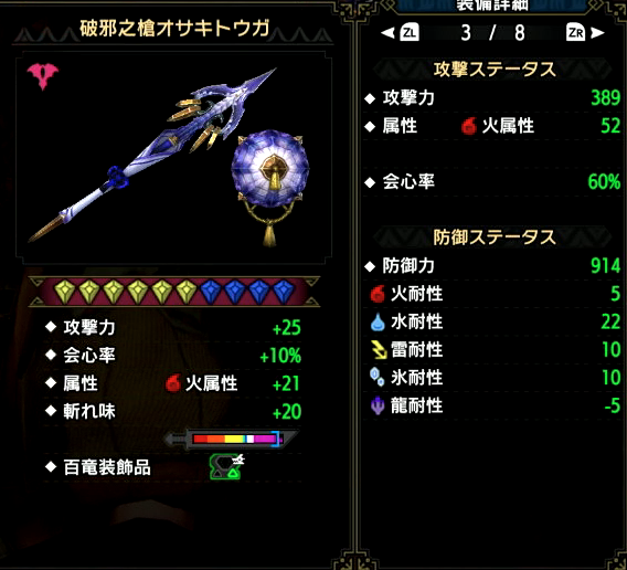 狩を楽しみつつ、破邪之槍オサキトウガの傀異錬成が完了しました。