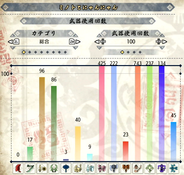 一応操虫棍使いって事で一番使っていますが、かと言って微妙な数字だったりします。