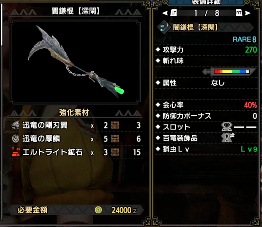 この後は、メル・ゼナの素材の爵銀龍の重牙と迅竜の天鱗を出してもう一段強化び闇鎌棍【深閑】改に。。そして最終強化の無明鎌棍【正語】は傀異化した牙だけなのですぐに集められそうです。