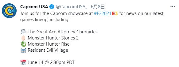 『大逆転裁判1&2 -成歩堂龍ノ介の冒險と覺悟-』『モンスターハンターストーリーズ2 ~破滅の翼~』『モンスターハンター ライズ』『バイオハザード ヴィレッジ』などのタイトルに関する最新ニュースを公開する「Capcom showcase」は日本時間6月15日6時30分から開始予定。配信はE3公式のTwitchやYouTubeなどで行われます。