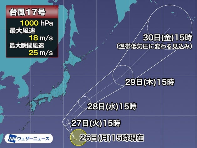 台風17号は、26日(月)夜から27日(火)昼頃にかけて父島など小笠原諸島に接近する予想です。暴風や大雨、高波のおそれがあるため、警戒してください。