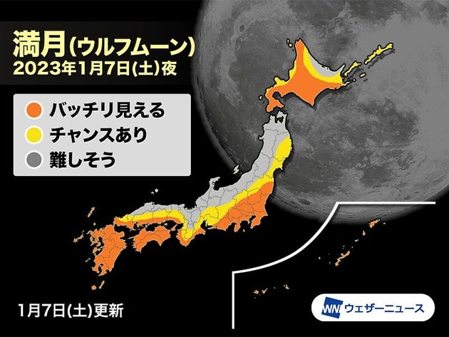今夜は日本海側の各地で雲が多くなりますが、関東や東海、西日本の太平洋側などでは晴れて満月を見ることができそうです。北海道も、日本海沿岸とオホーツク海側で雲が多めですが、見られる所が多い見込みです。