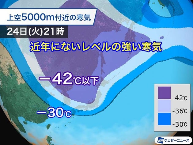 寒波は24日(火)から襲来し、24日(火)の夜から25日(水)の朝がピークとみられます。今回の寒波の特徴は、上空の寒気が低い所から高い所まで強い点です。