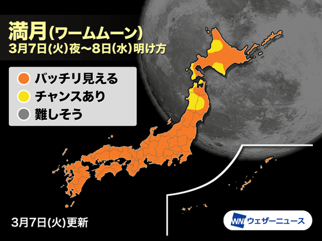 今夜は満月「ワームムーン」 名前の由来は?全国の天気は?