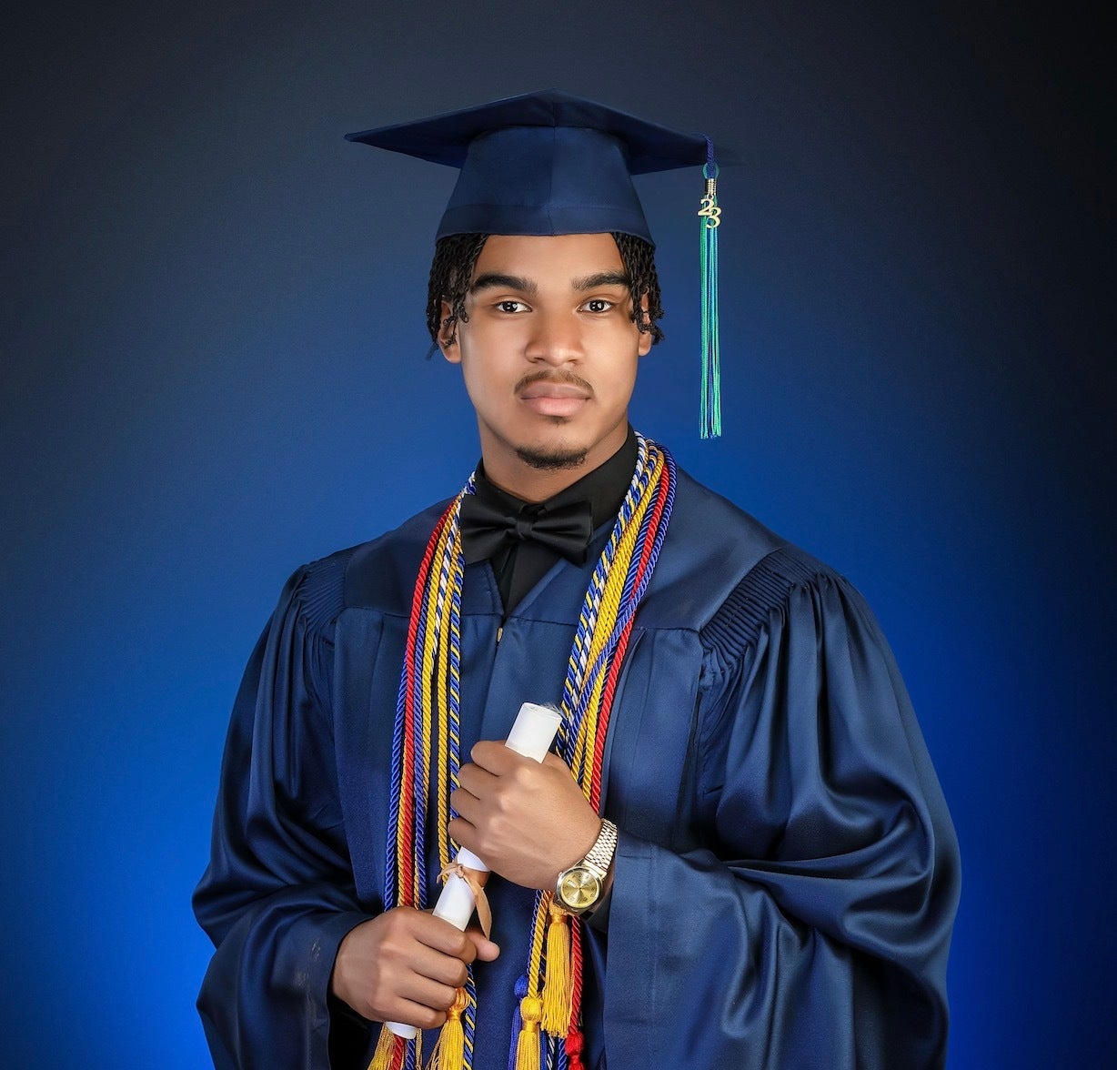ヒューディーさんは大きなお腹を抱えて壇上に上がり、証書を受け取り、学長と記念撮影。その後、病院に向かい、3日後に元気な赤ちゃんを出産した。