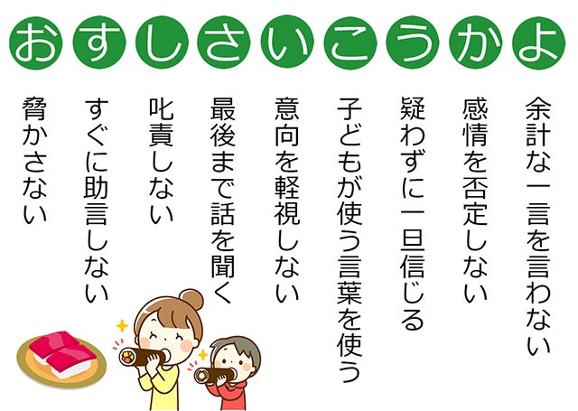 そして、もし子どもが死を思わせる言葉を口にしたら、「『死にたいなんて言わないで』と子どもの発言を否定したり、『美味しいものでも食べよう!』と話を逸らさず、『死にたい』と言えた子どもの勇気を讃え、受け止めてほしい」と伝えます。