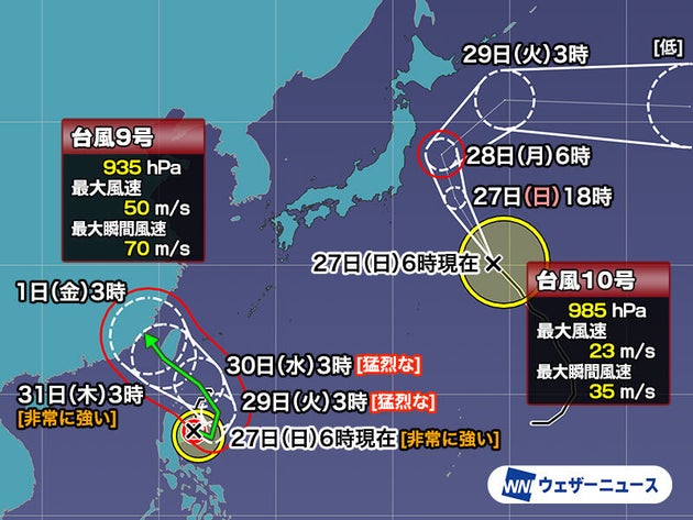 台風9号、台風10号の進路予想は?台風9号は猛烈な勢力となる見込み