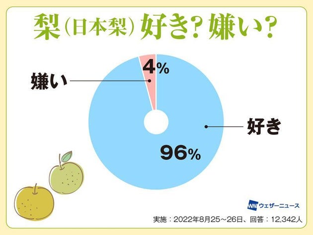 ウェザーニュースでは、2022年に梨が好きか嫌いか、アンケート調査を行ったところ、なんと好きという回答が96%! 男女や世代を問わず、みんなに支持される果物だということが分かりました。