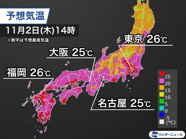 明日は九州を中心に25℃以上の夏日の所があり、明後日2日(木)の午後は関東平野や九州などの広い範囲で25℃を上回るとみられます。11月らしからぬ陽気で、各地の最高気温は東京都心が11月として14年ぶりの夏日となる26℃、名古屋市と大阪市は25℃まで上がる予想です。
