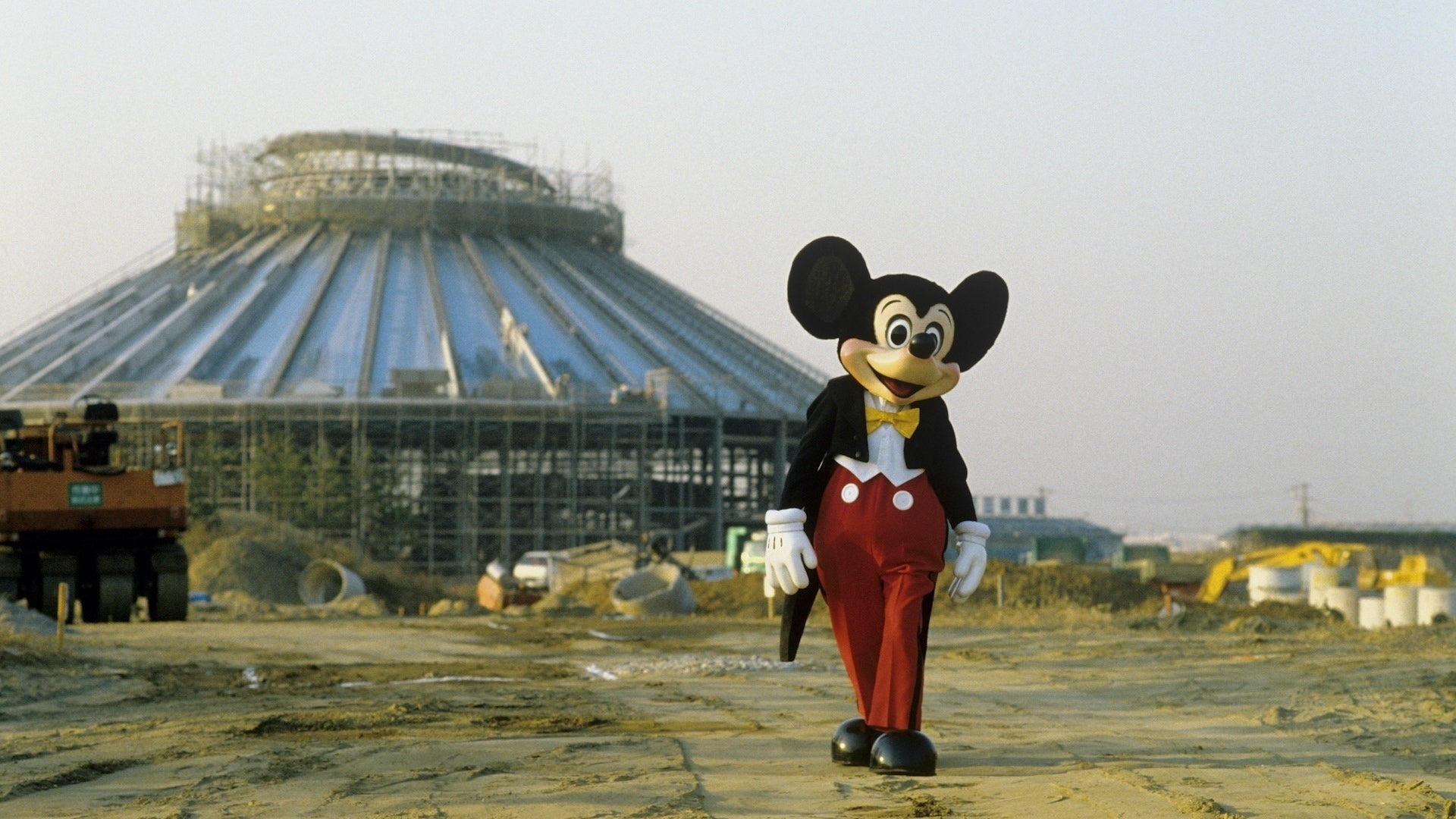 巨大なパークが完成する前に撮影された貴重な姿をおさめた写真があります。ミッキーマウスは、まだ建設途中の段階であったパークを歩いていました。ディズニープラスの公式X(旧Twitter)が2020年に公開しています。
