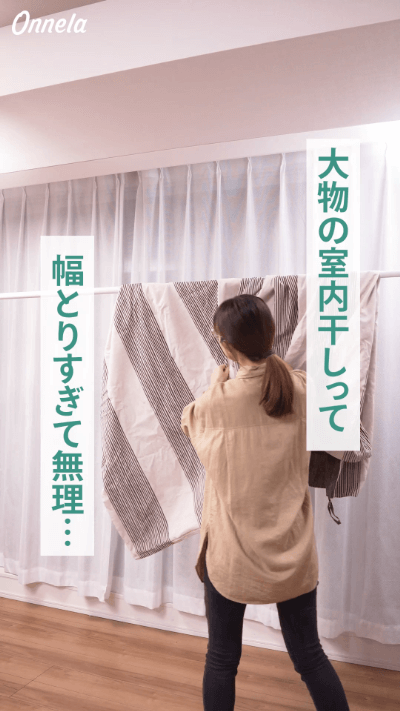 シーツやカーテンなど大物の部屋干し、どうしていますか?部屋干し用のラックなどに干すと、幅をとりすぎて他の洗濯物がかけられなくなることも。