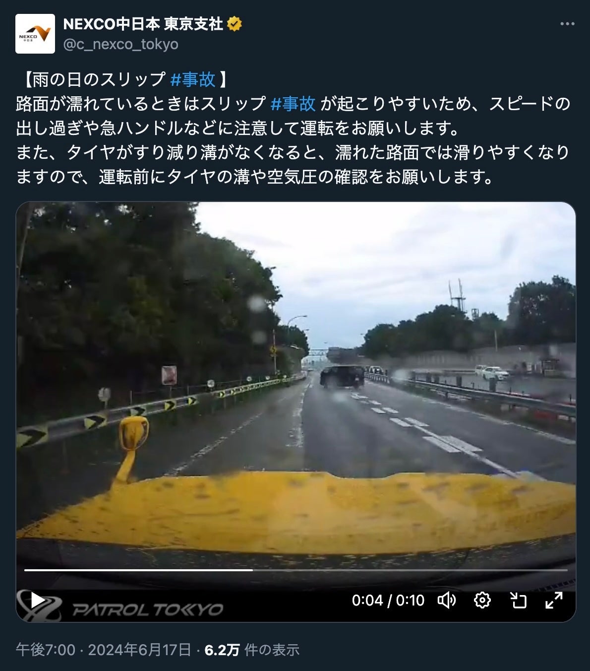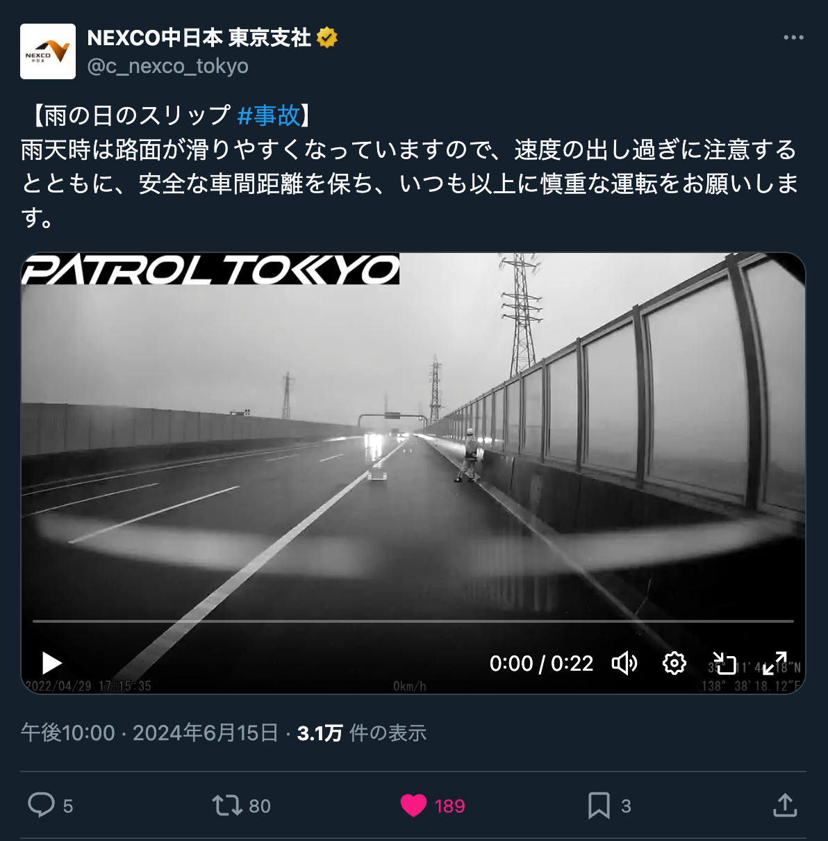 NEXCO中日本東京支社が、グループ会社の「中日本ハイウェイ・パトロール東京」から提供を受けた映像をXアカウント(@c_nexco_tokyo)に公開した。