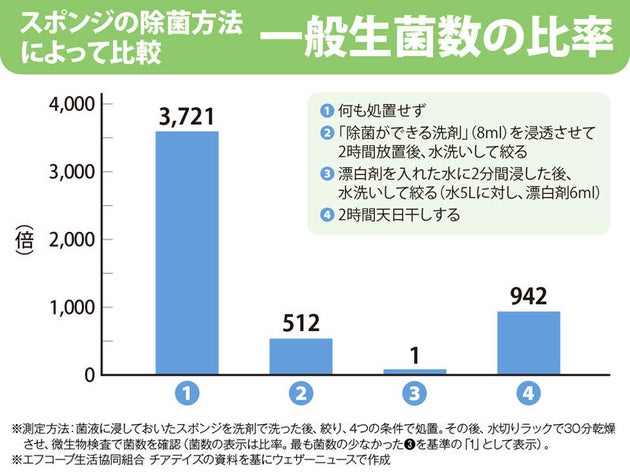 「検証の結果、除菌に効果があったのは、『漂白剤に浸けて水洗いして絞る』、次に『除菌ができる洗剤を浸透させてから水洗いして絞る』でした。