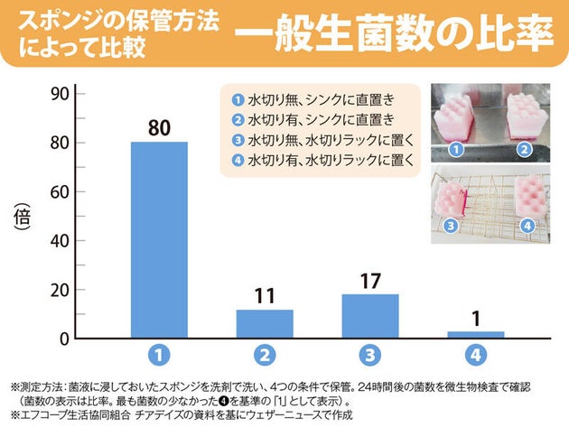 スポンジの保管の仕方によっても菌数が変わるそうです。ここでは「水切り無、シンクに直置き」「水切り有、シンクに直置き」「水切り無、水切りラックに置く」「水切り有、水切りラックに置く」という方法で検証しています。