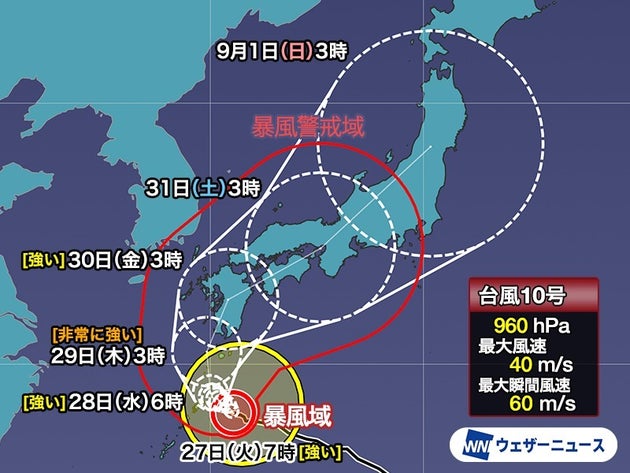 ・週後半にかけて台風10号の影響大 日ごとの暴風警報の可能性は