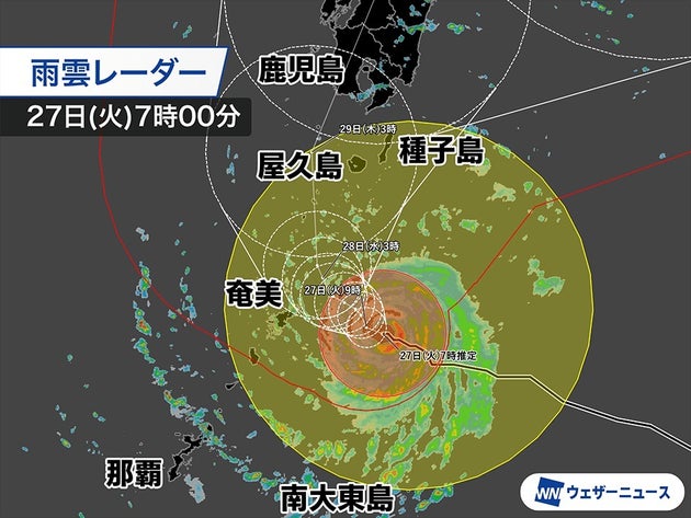奄美地方では今日は次第に暴風・大雨の影響が大きくなり、28日(水)にかけて影響が継続するおそれがあります。種子島・屋久島地方でも28日(水)からは暴風の影響が大きくなるため警戒してください。