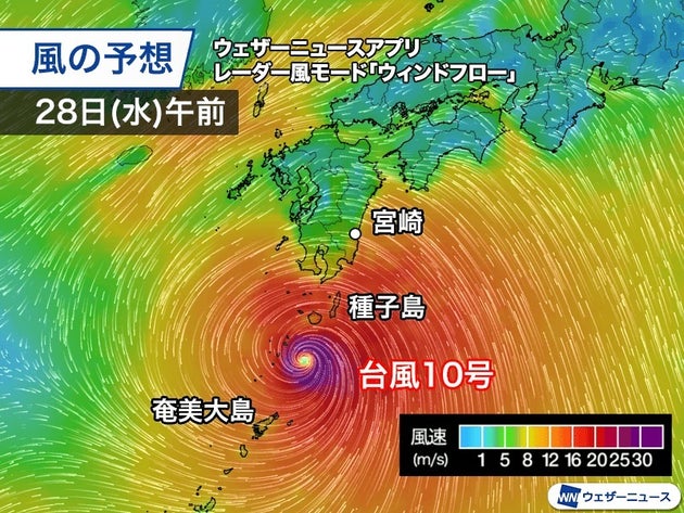 九州では28日(水)頃から影響が大きくなり、瞬間的に40〜50m/sの猛烈な暴風が吹き荒れるおそれがあります。その他の地域でも暴風の影響が長引くおそれがあります。