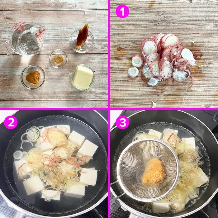 ① 器にみそとお湯を入れてよく混ぜる。