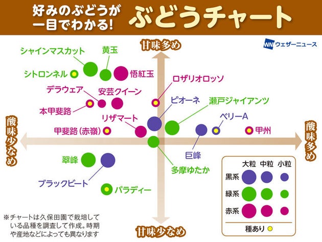 知ってる?好みのぶどうに出会う方法。甘さや粒の大きさでお気に入りの品種を選ぼう【ぶどうチャート】