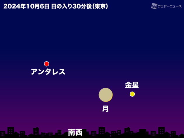 10月6日(日)には、月が金星に接近します。幻想的な細い月と金星の共演は見ものです。