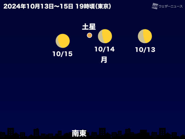 10月14日(月)には、月が土星と接近します。東京で21時頃には南の空高くに昇って観測しやすいため、晴れていたら両者の姿を探して空を見上げてみてください。