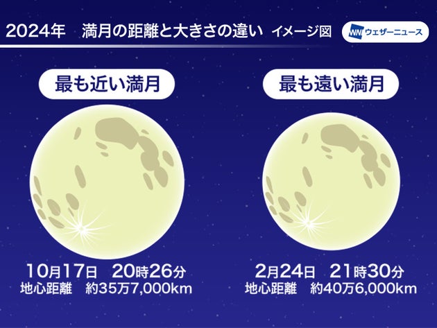 国立天文台によると、今年最小の満月(2月24日)と比較すると、見かけの直径は約14%大きく見えるとのことです。別の日の月と並べて比較することができないため、この日の満月だけ見ても変化は分かりづらいかもしれませんが、晴れたら空を見上げてお月さまの大きさを確認してみてください。