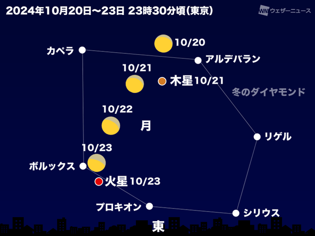 10月は真夜中になる頃には「木星」と「火星」が東の空に昇ってきます。木星を囲うようにして、冬の星座の1等星を結んで描く「冬のダイヤモンド」も見られるため、大変賑やかな様子を楽しむことができます。