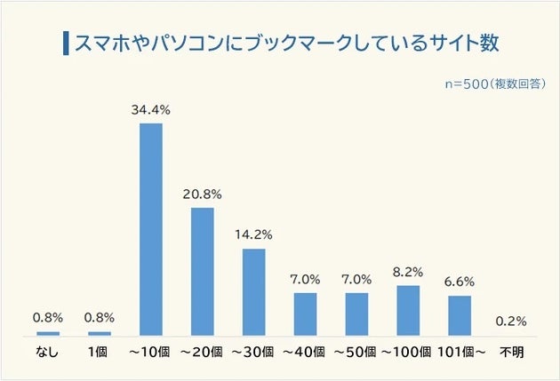 スマホやパソコンにブックマークしているサイトの数について尋ねると、一番多い回答は2〜10個という結果になりました。