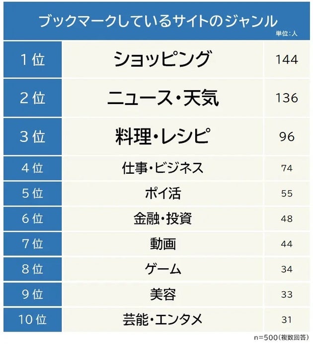 みんながブックマークしているサイトのジャンルは?レシピや天気より人気なのは◯◯