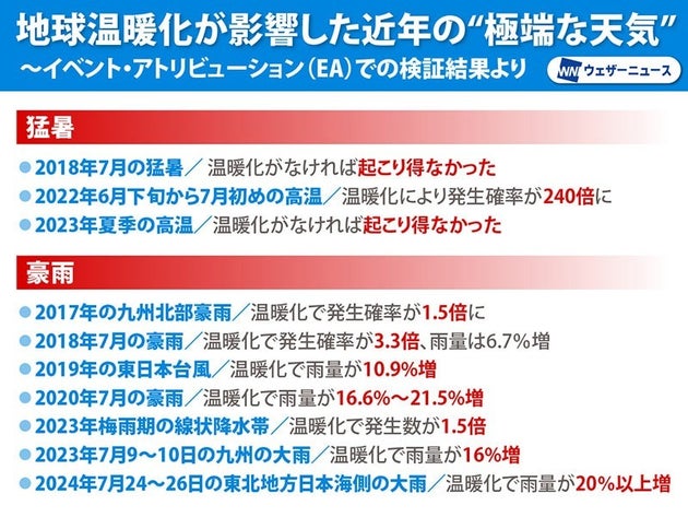 EAによる検証によって、多くの極端現象で温暖化がなければ発生する可能性が低かったり、強さが違ったりしている可能性が高いことがわかってきています。