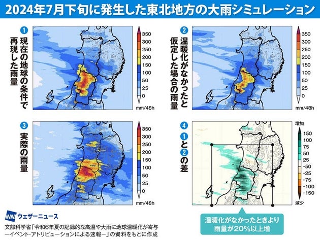 実際の地球の条件で再現した雨量(1)と、温暖化がなかったと仮定した場合の雨量(2)の差(4)から、「温暖化がなかったときより雨量が20%以上増」ということがわかりました。