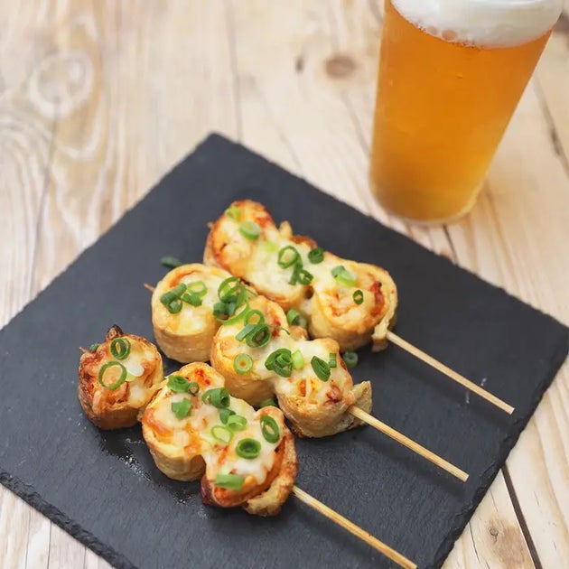 キムチとチーズを油揚げでくるくる巻いた串焼きレシピ!マヨネーズが入っているのでキムチの味もまろやかで、食べやすくなっています。