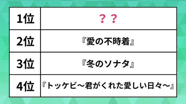 第1次韓流ブームの火付け役ともなった『冬のソナタ』が3位にランクイン。日本でも大人気となった俳優ペ・ヨンジュンさんとチェ・ジウさんが織りなす運命的なラブストーリーです。