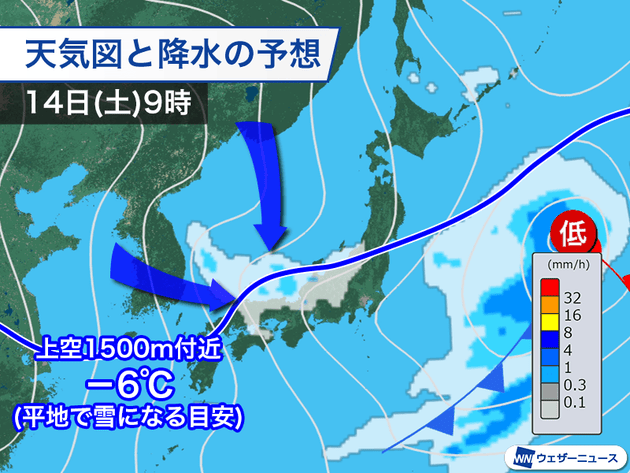 明後日14日(土)から15日(日)は冬型の気圧配置が強まります。明日は平地で雪を降らせる目安の上空1500m付近で−6℃以下の寒気が、九州北部や中国地方まで南下する予想です。