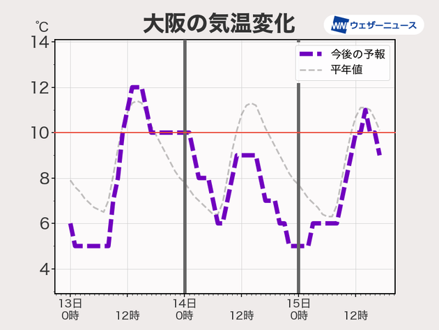 大阪市の気温の推移を見ると、明後日14日(土)は日付が変わった直後が最も気温が高く、朝にかけて6℃まで下がる見込みです。その後は昼間も気温が上がらず10℃未満の予想となっています。グレーの破線で示された平年よりも大幅に低い上、北寄りの風が強く吹くため寒い一日です。