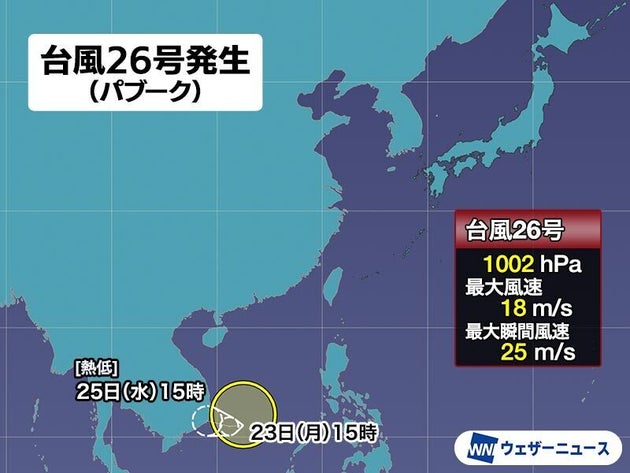 12月23日(月)15時、南シナ海で発達中の熱帯低気圧が台風26号(パブーク)になりました。