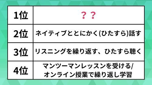 英語を何度も聴いて耳を慣れさせるという、リスニング力の向上が3位に選ばれた。