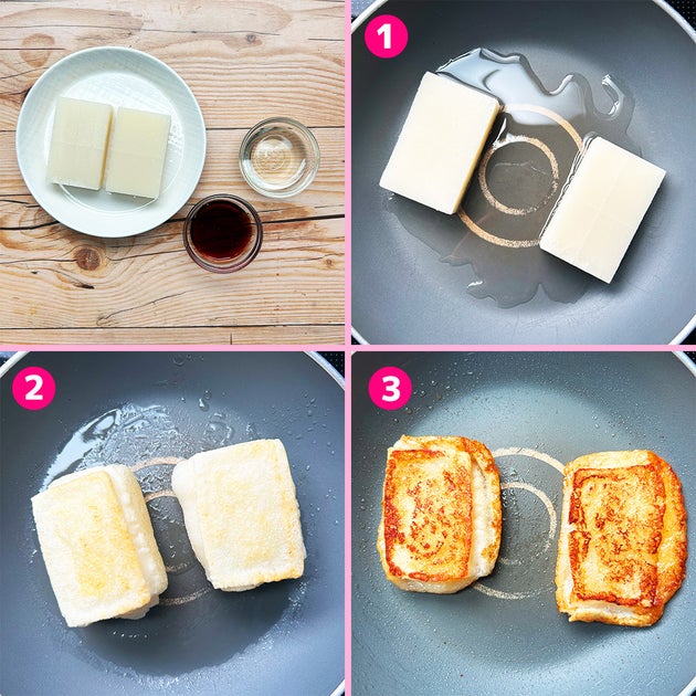① フライパンにサラダ油を引き、切り餅をのせたら弱火に熱する。