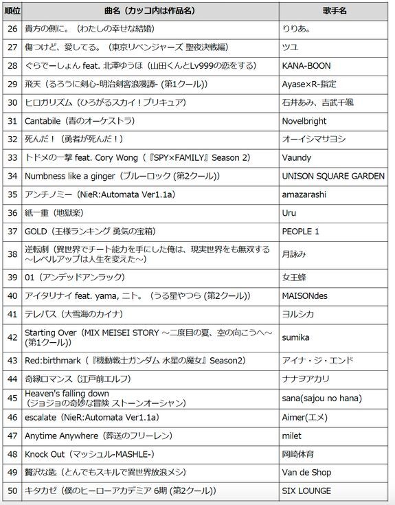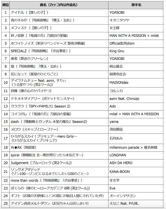 2位は、人気アニメ『呪術廻戦』第2期「懐玉・玉折」 のOPテーマで、キタニヤツヤの「青のすみか」。2023年の「第74回NHK紅白歌合戦」では、特別編集されたアニメ映像とコラボした演出が話題になったといいます。