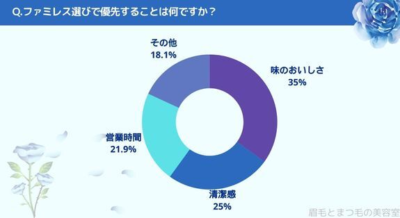 ファミレス選びで優先することは「味の美味しさ(35%)」、「清潔感(25%)」、「営業時間(21.9%)」、「その他(18.1%)」という結果になりました。