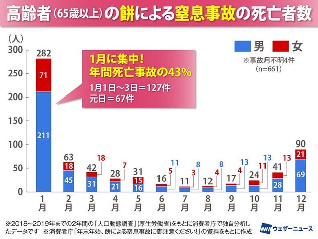 この調査を基に消費者庁が行った分析では、65歳以上の餅による窒息事故の死亡者数は2018年が363人、2019年が298人の計661人にも達しています。このうち男性が477人(72%)、女性が184人(28%)で、男性が女性よりも2.6倍も多いことがわかったといいます。