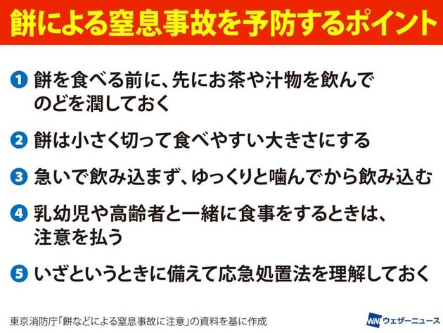 「まず、餅などを食べる前にお茶や汁物を飲んで、のどを潤しておくようにしましょう。そのうえで食べやすい大きさに小さく切っておき、食べる時は急いで飲み込まず、ゆっくりと噛んでから飲み込んでください。