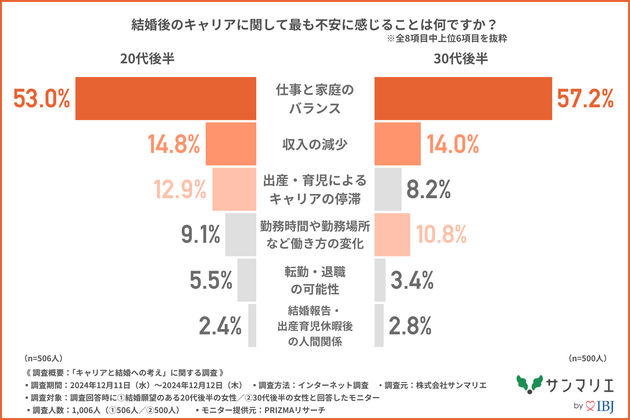 「結婚後のキャリアに関して最も不安に感じること」について聞くと、20代後半は多い順に「仕事と家庭のバランス」(53.0%)、「収入の減少」(14.8%)、「出産・育児によるキャリアの停滞」(12.9%)。
