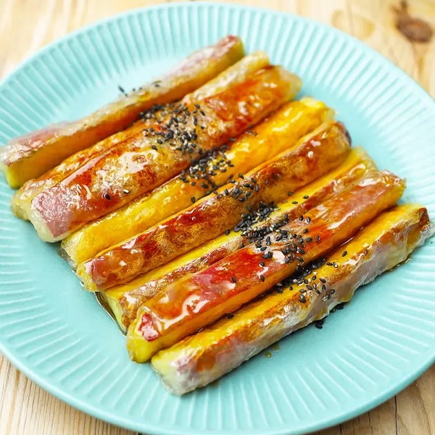 レンジで加熱したさつまいもを、ライスペーパーで巻いて焼いた大学芋のレシピ!揚げていないのにカリッともちもちは、まさに新食感です。甘いたれが食欲そそる!おやつにピッタリですよ。
